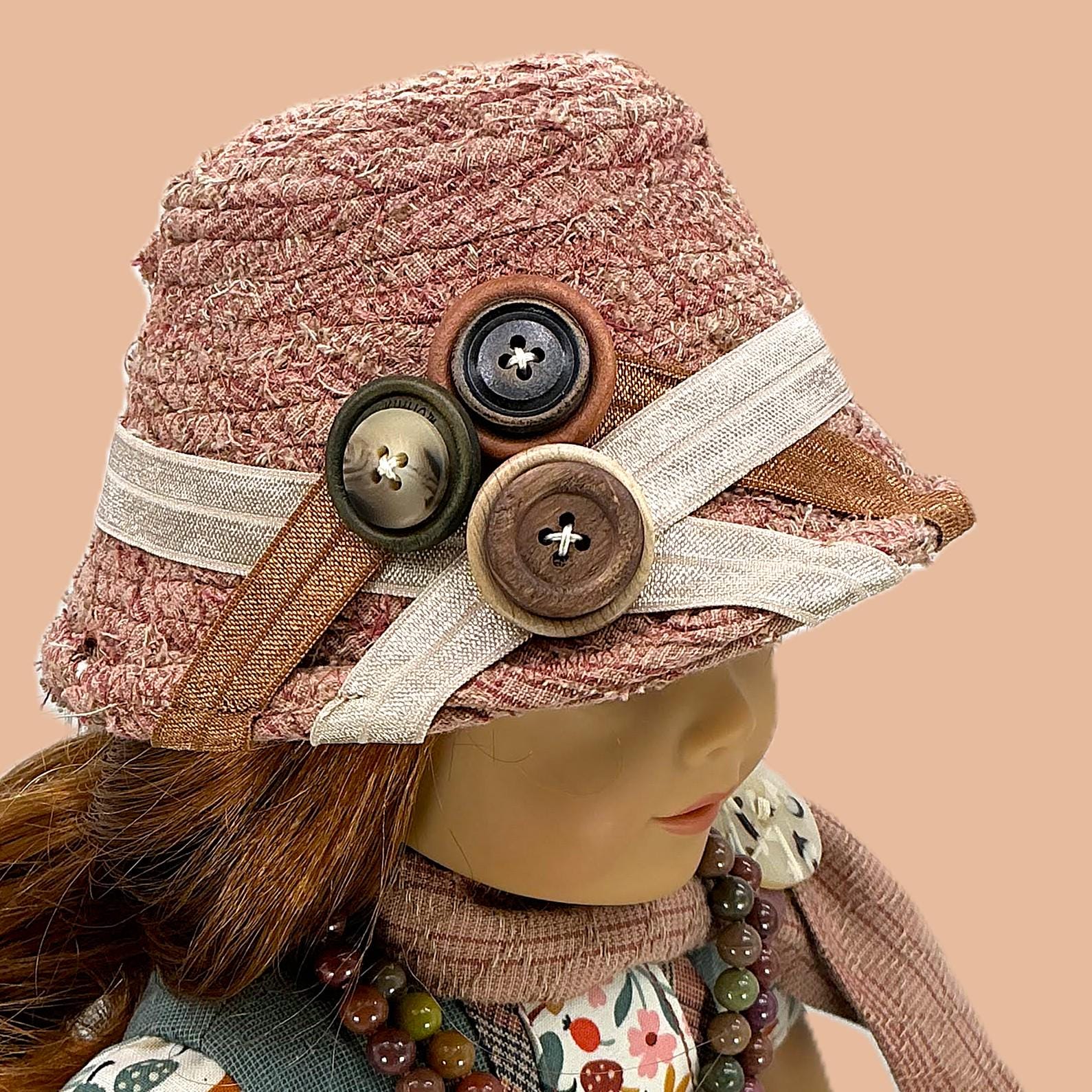 3. The cloche style hat is fabric covered coils with button accent around the rim.