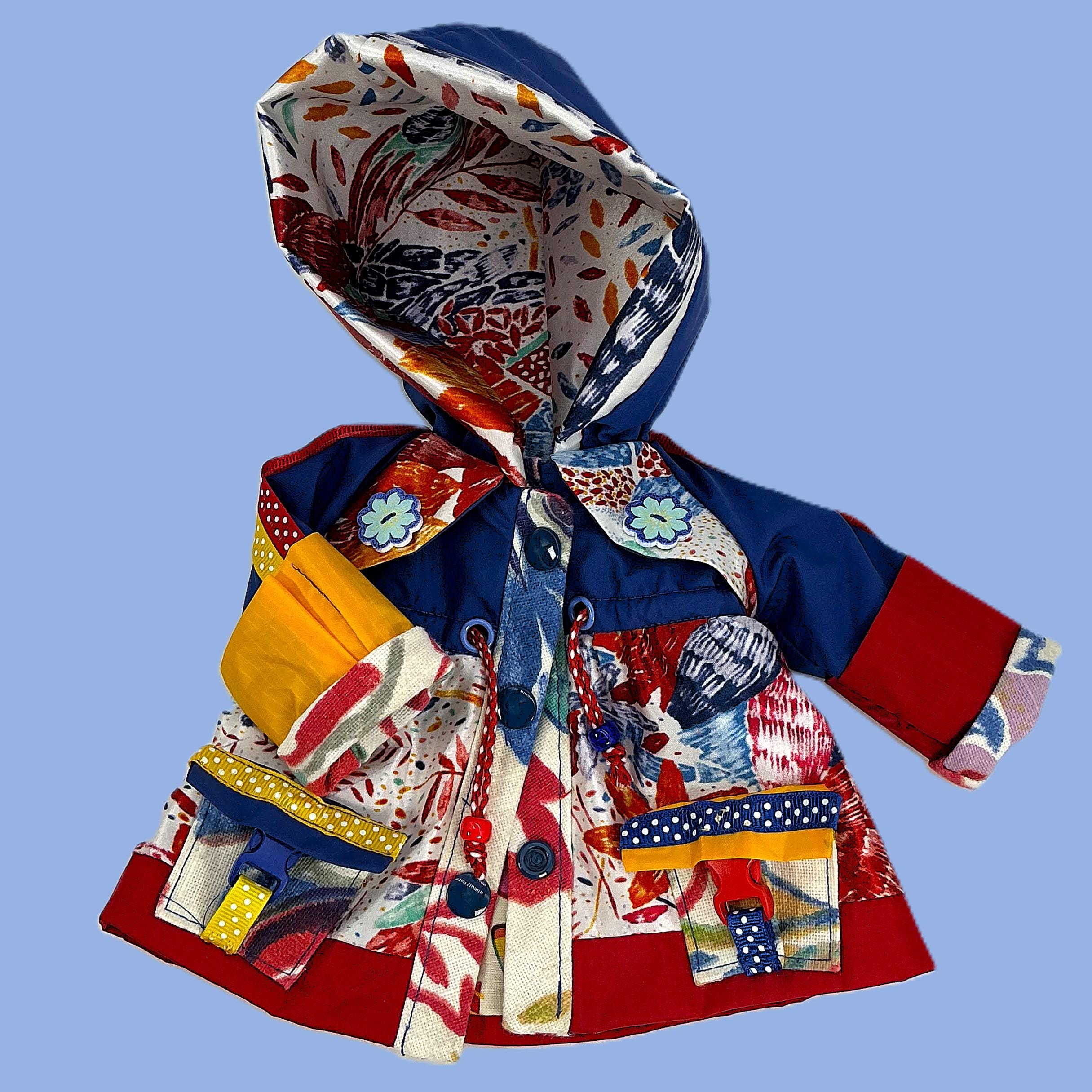 1. The hooded windbreaker is made with red, blue and yellow ripstop and a candy themed cotton print lining. Multiple trims are used on the jacket.