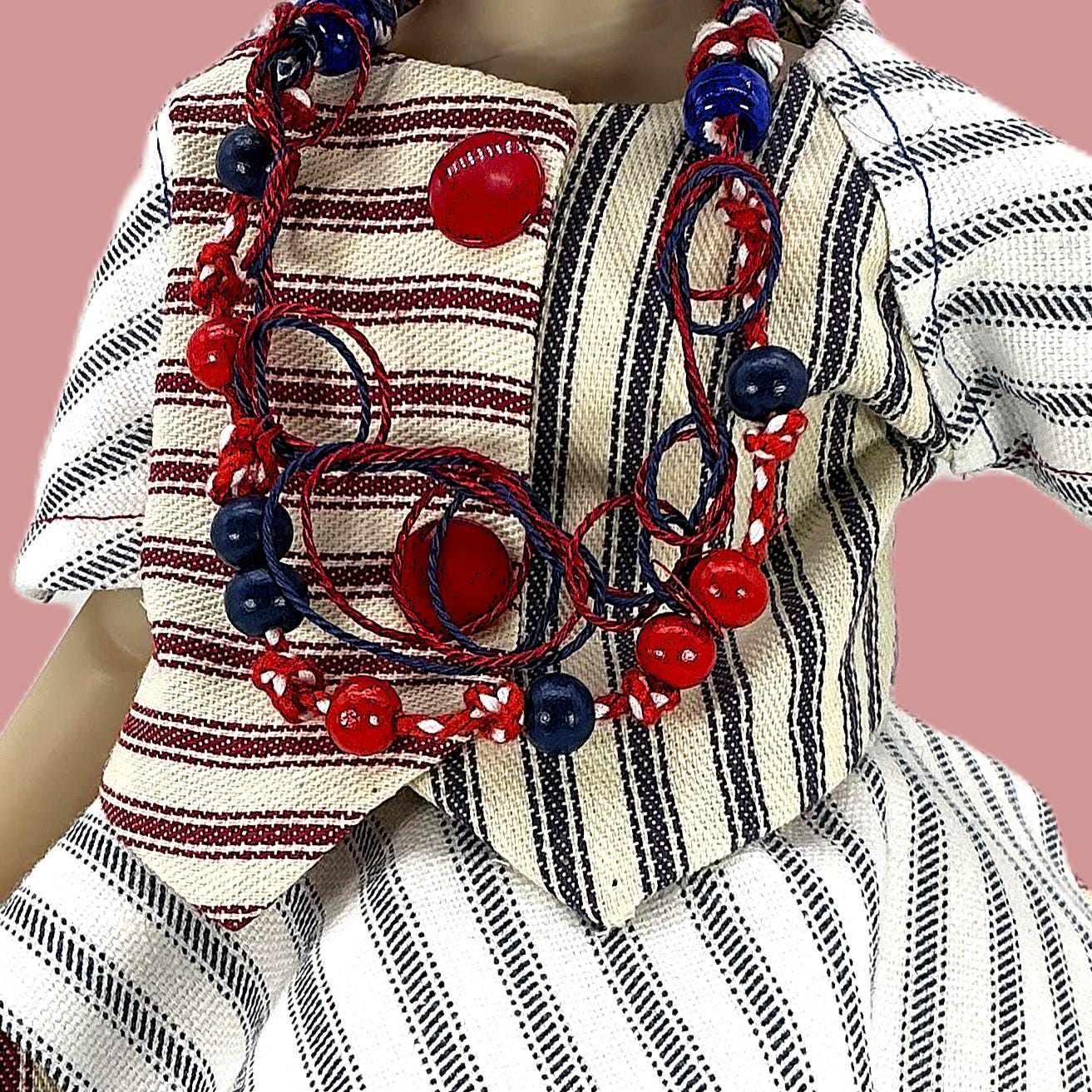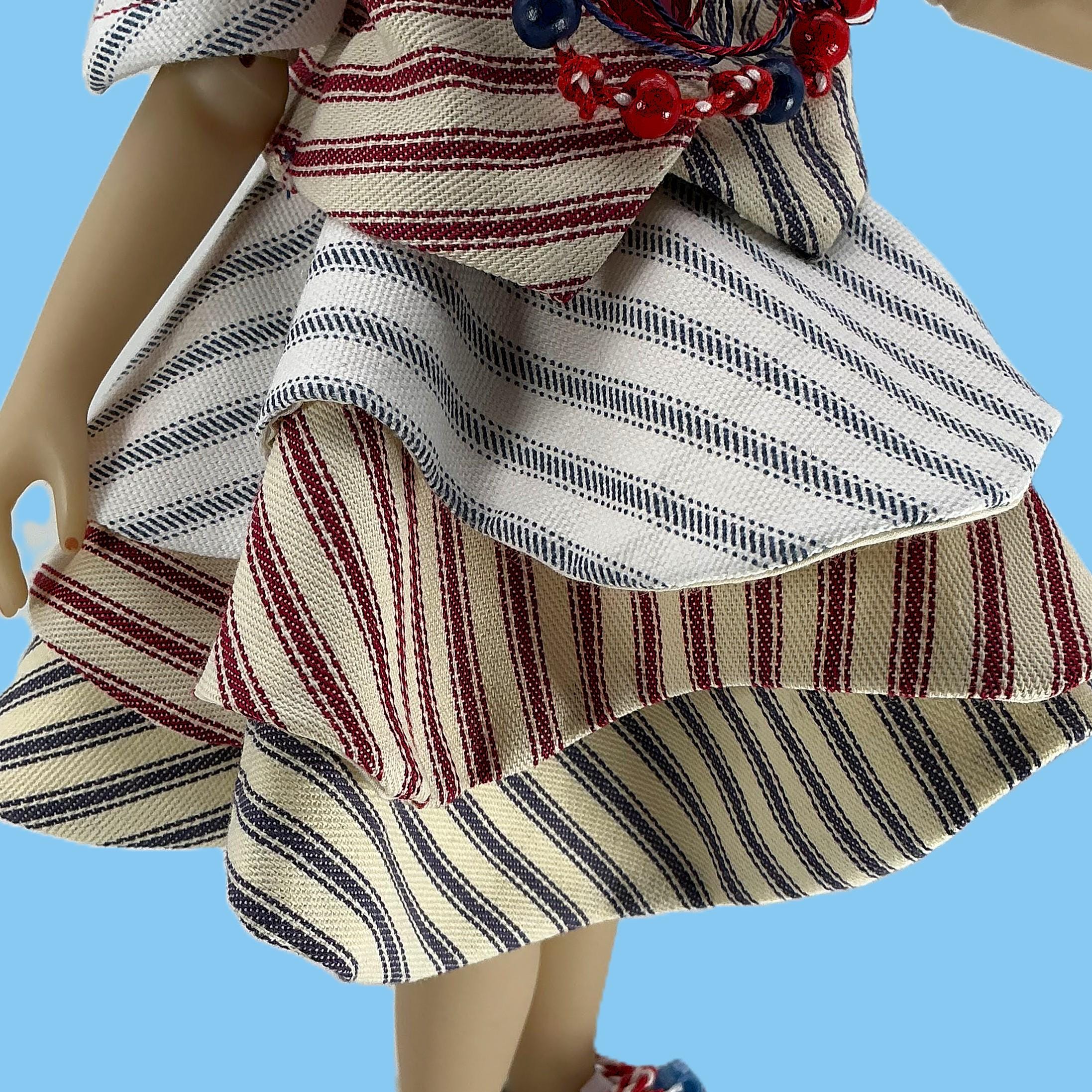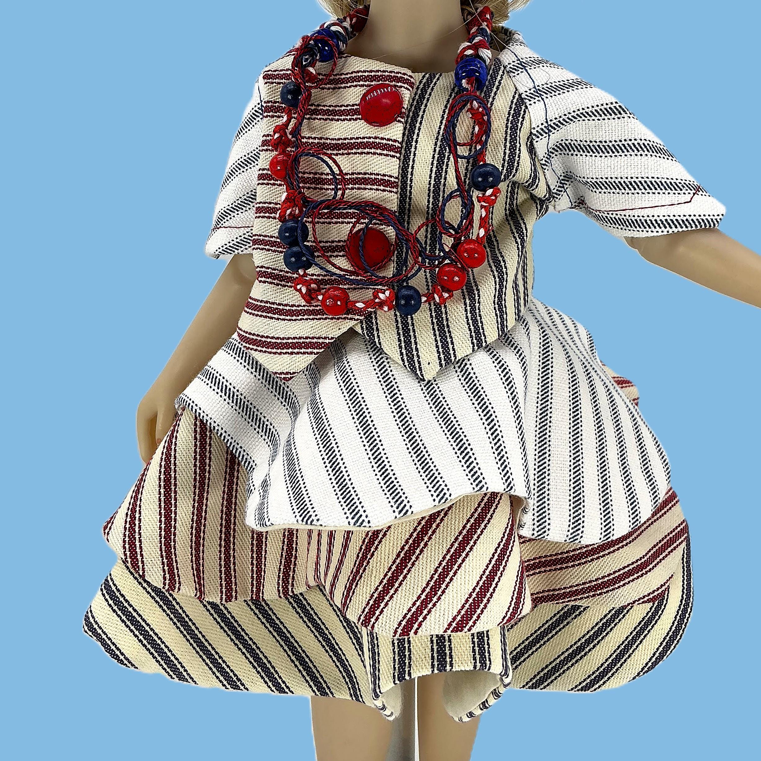2. The layered petal Skirt and Top are made from red, white and navy cotton ticking.