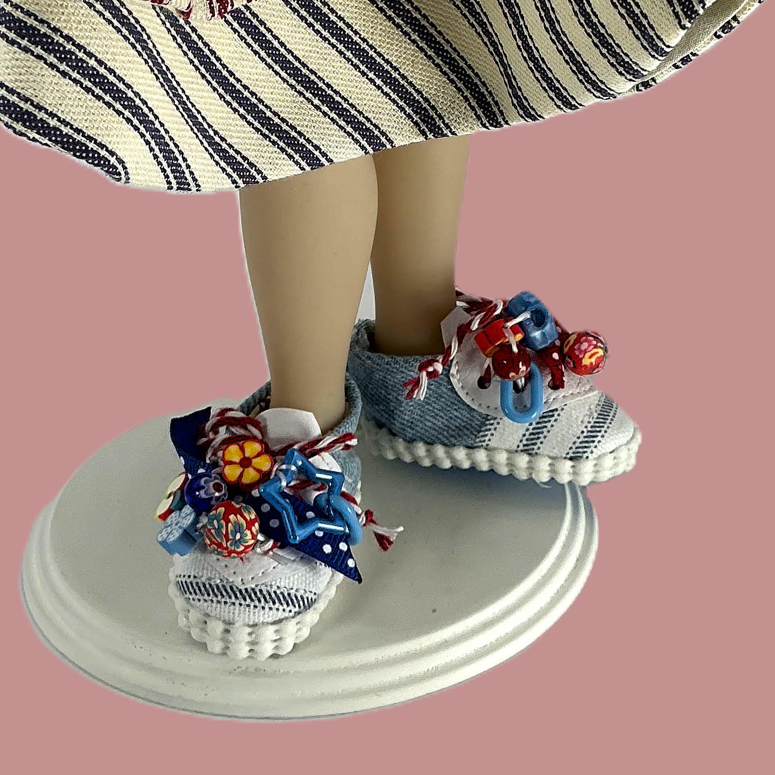 4. The Tennis shoes are made from twill ticking and charmed out in beads, clay buttons and ribbon. The shoes are slip on.
