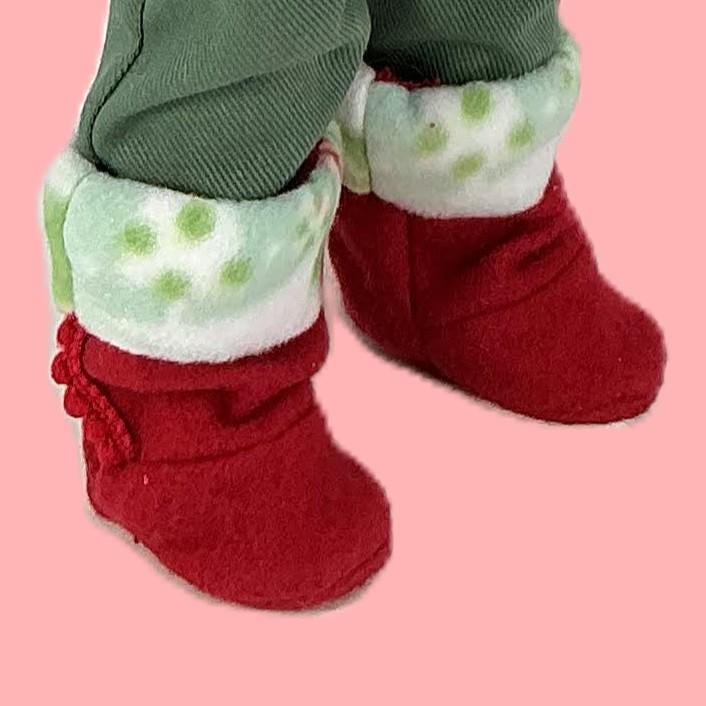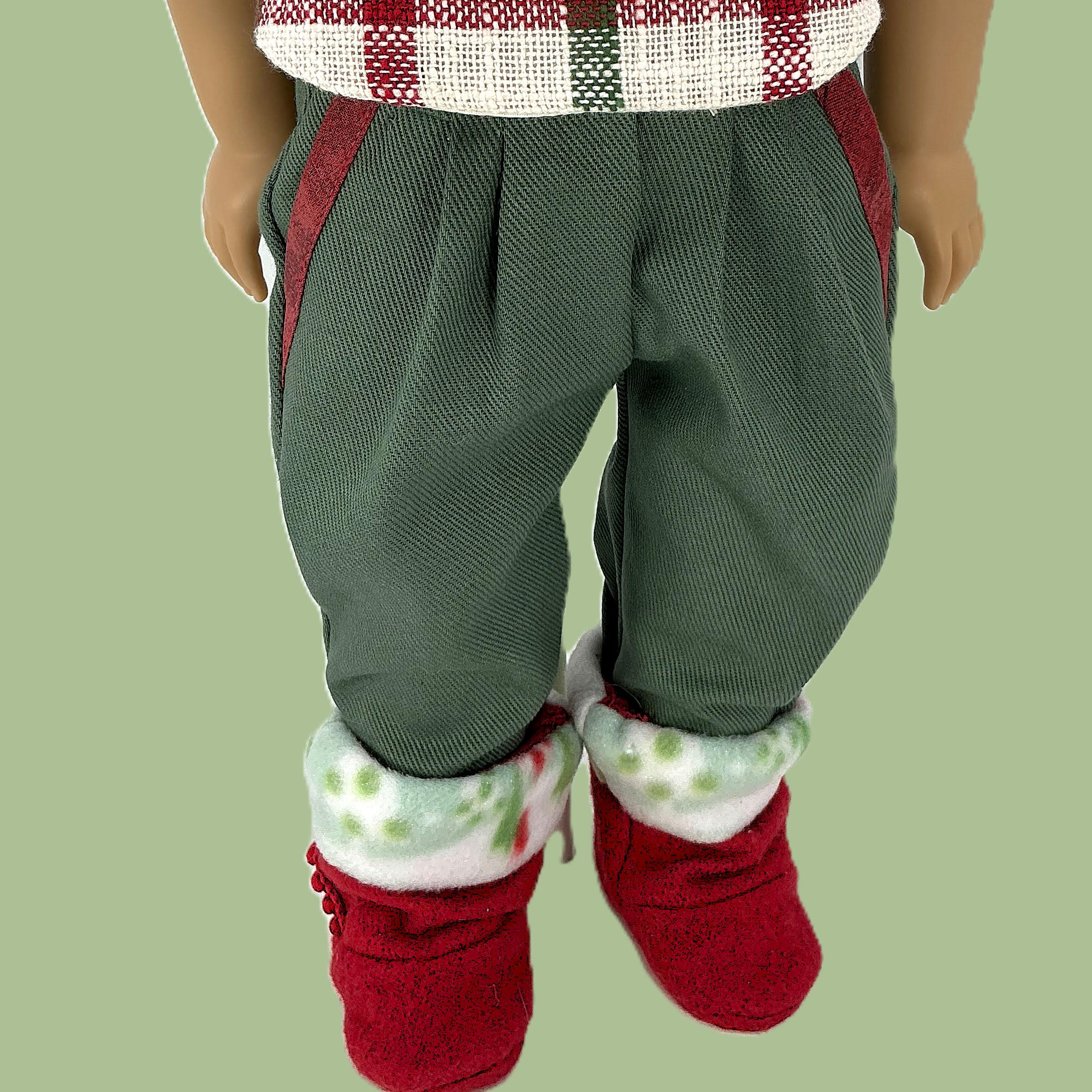 DETAILS: Holiday red and green colors! The fabrics are cotton, flannel, fleece, twill, and knits. Charms, ribbons, and buttons are used as trim. Items have finished seams or lining.