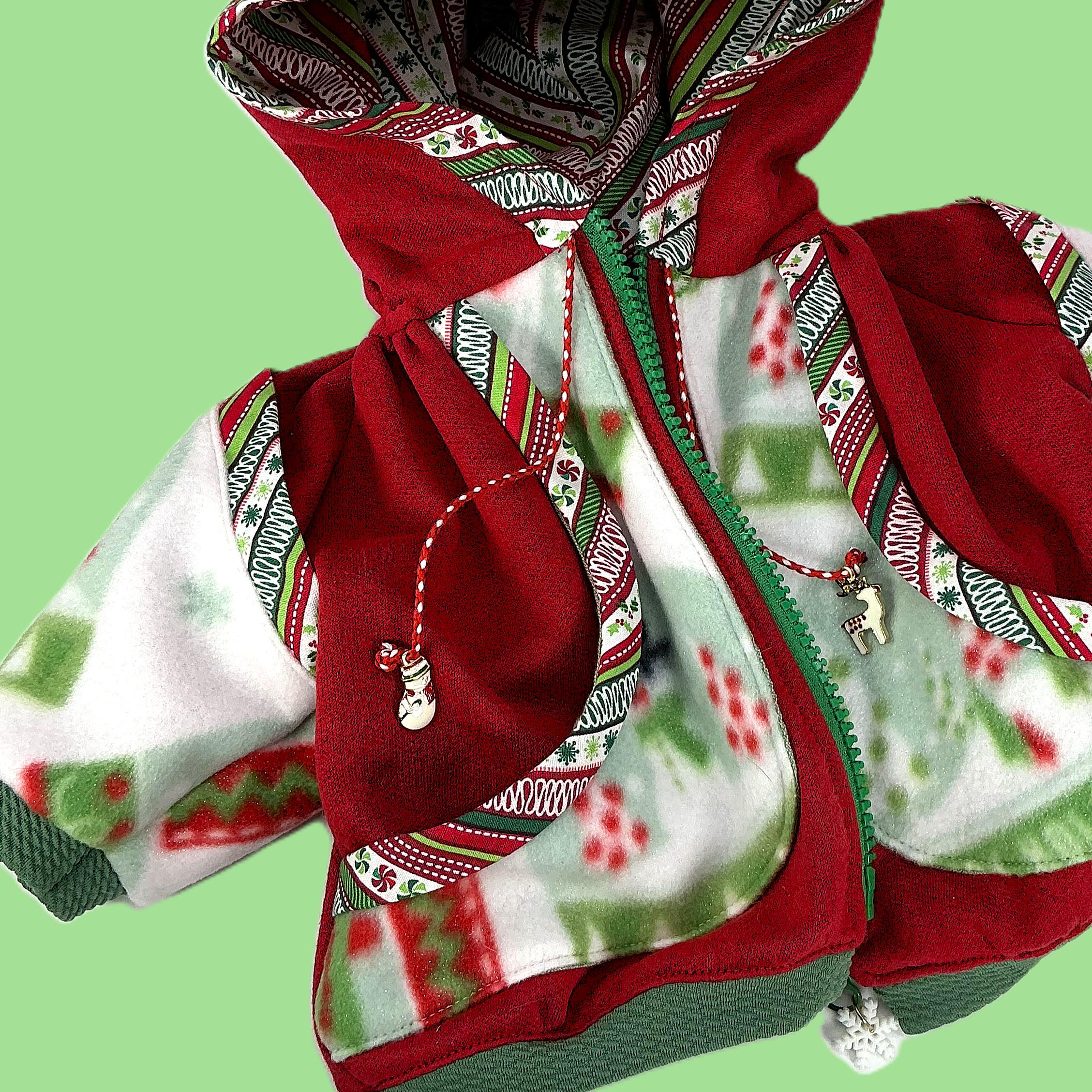 5. The hoodie is oversized with a front zipper. It’s made from red French terry and holiday colored sparkle fleece with a holiday candy cotton lining. There are enameled charms hanging from ties and zipper.