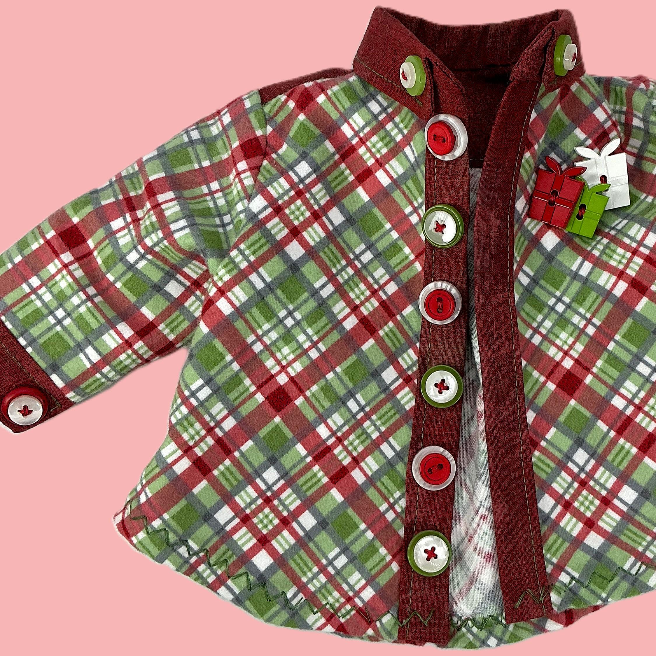 2. The top is a loose weave cotton, red, green and cream windowpane fabric. Ribbons form the collar.