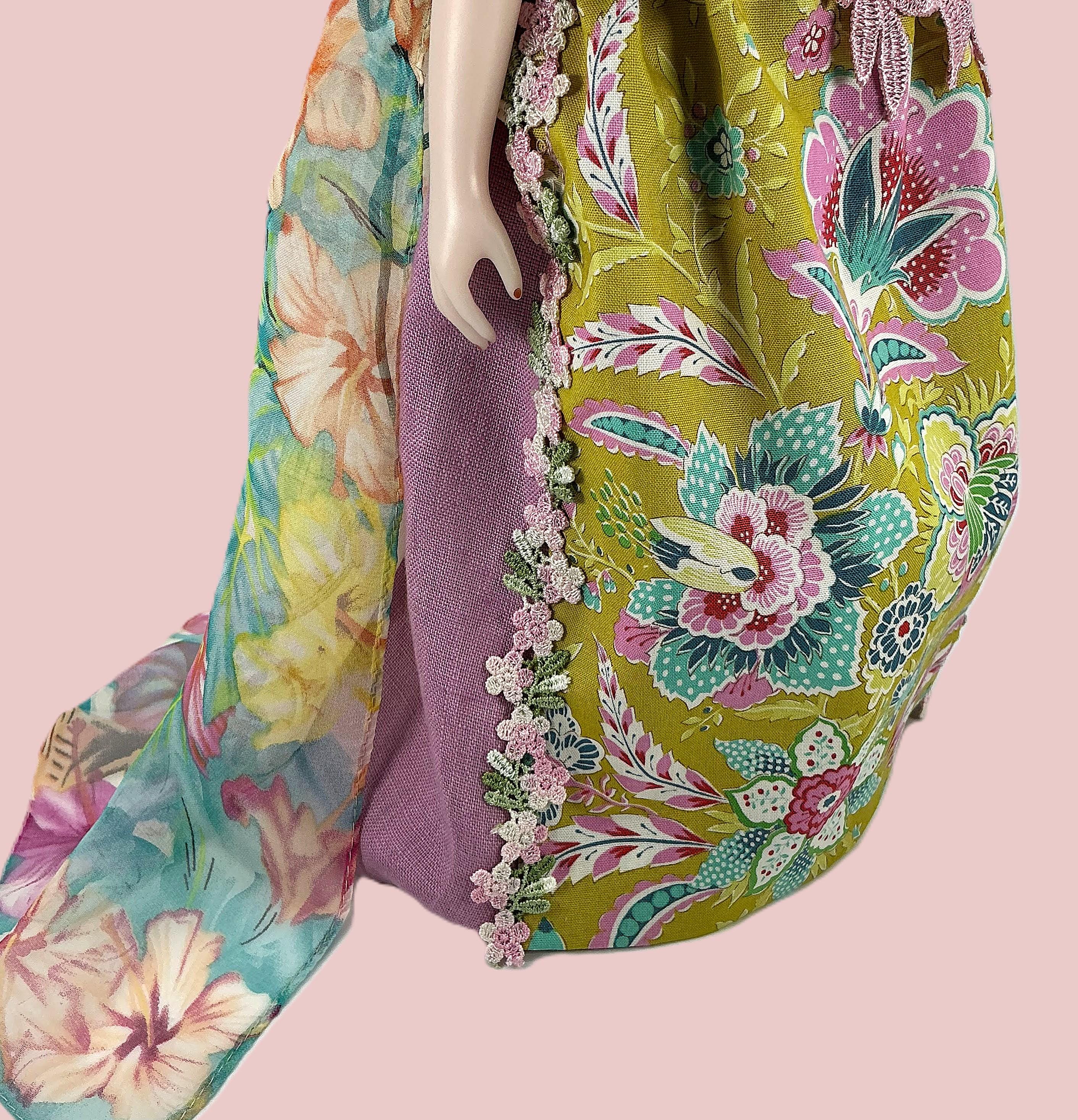 1. The bib-front Regency era dress is made with a premium chartreuse, teal and orchid floral cotton print, orchid linen and flowing floral voile. The puff sleeves and bodice are gathered voile. The collar is soft pink 3-D embroidered floral trim that flows from front to back. The skirt front has vining satin embroidered floral trim. The back of the dress is linen overlaid with a multi-colored watercolor floral train. The drop front is secured with snaps. The dress is fully lined.