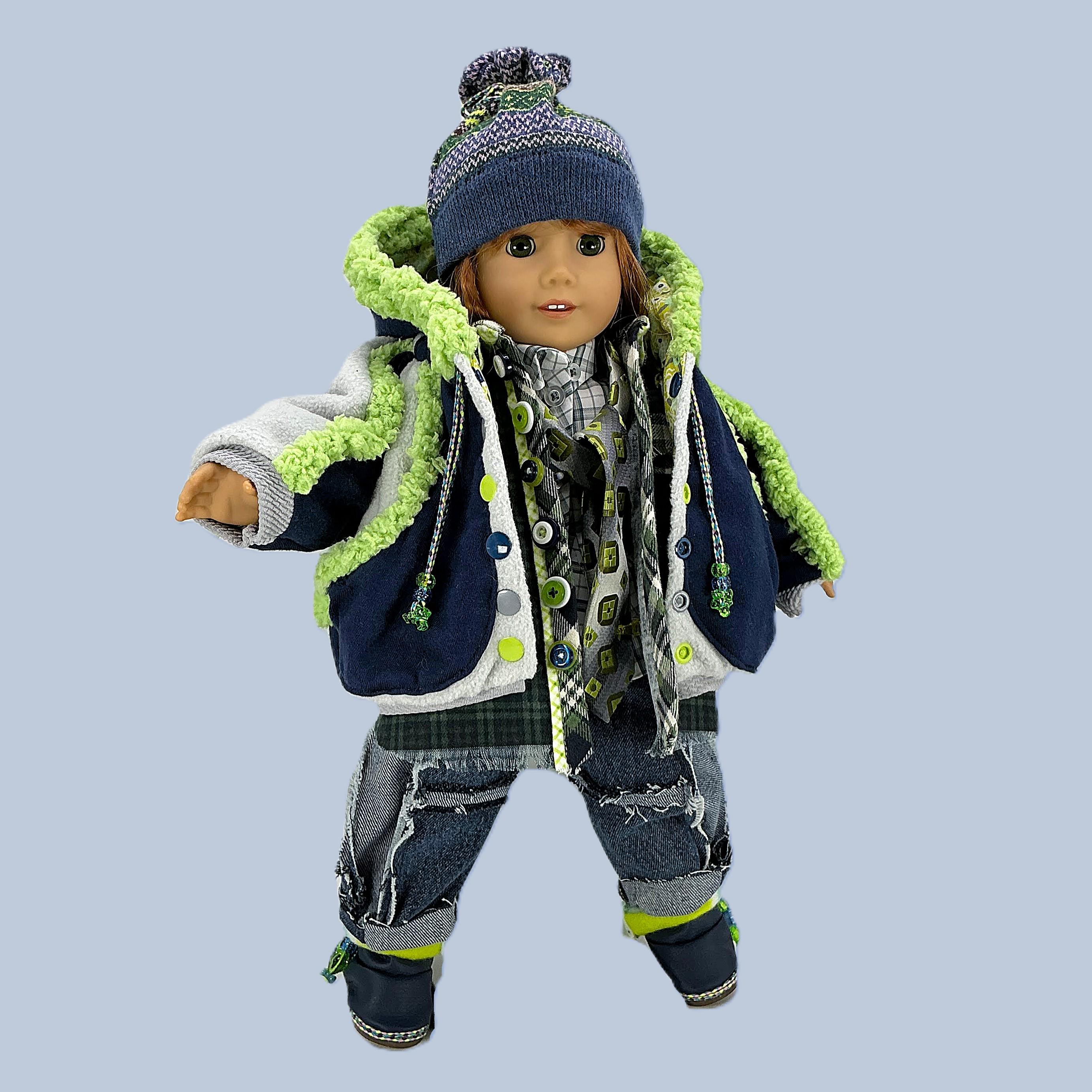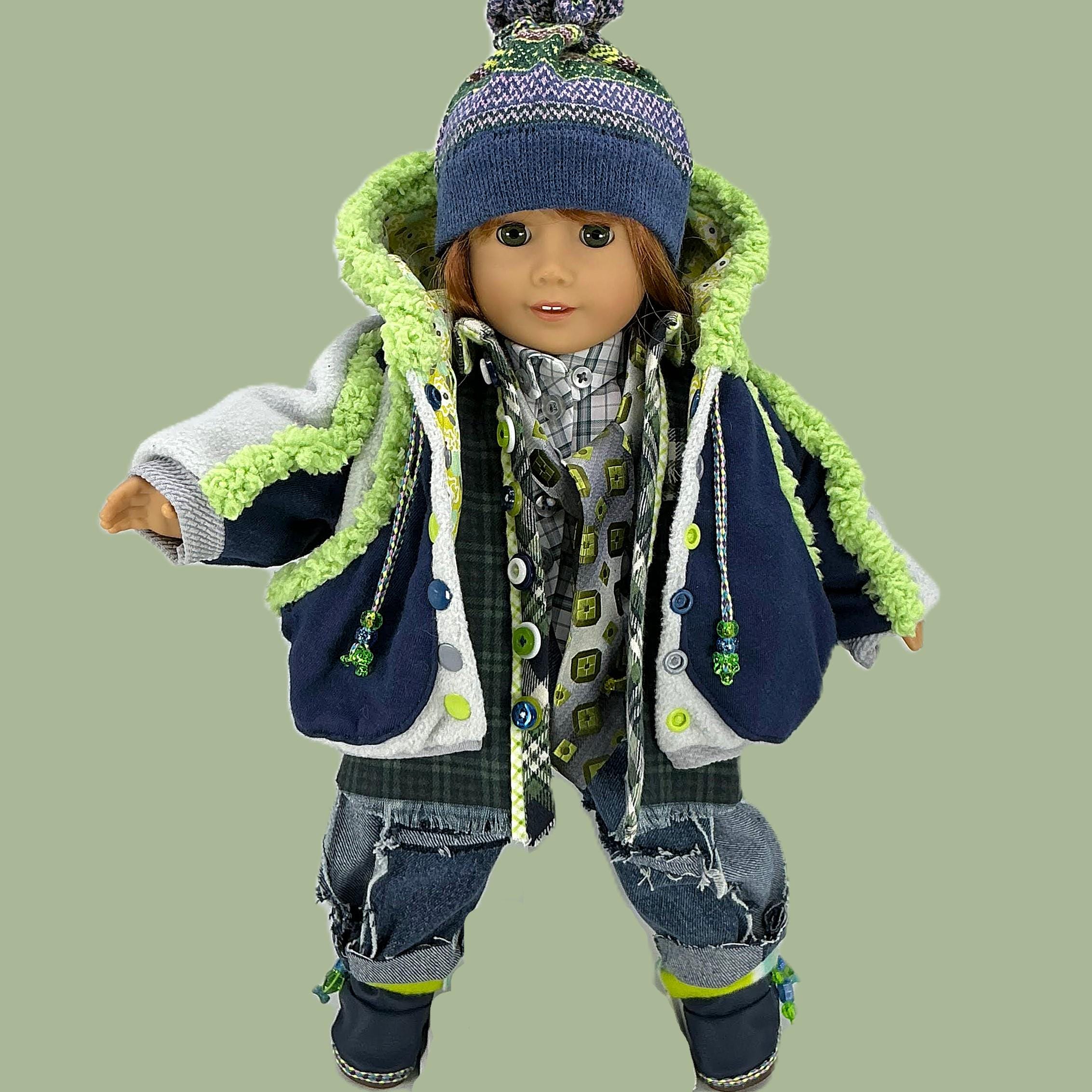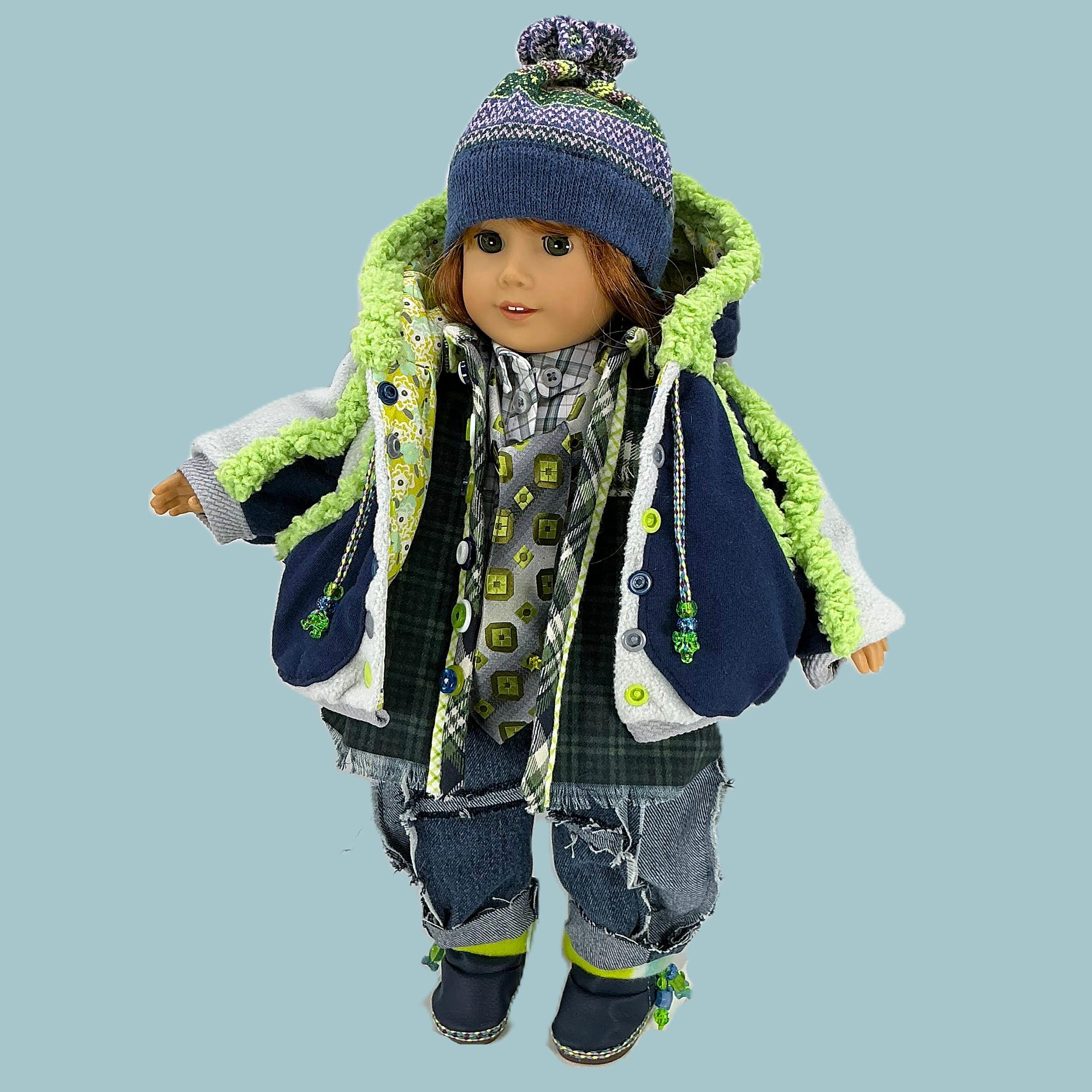 DETAILS: Winter navy blue and lime green colors! (kinda like the Sea Hawks). The fabrics are cotton, flannel, fleece, denim, and knits. Charms, ribbons, and buttons are used as trims. Items have finished seams or lining unless distressed.