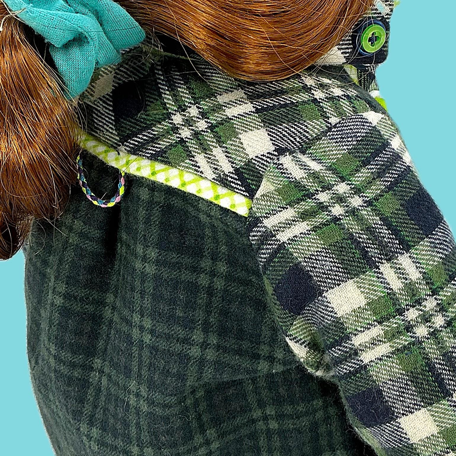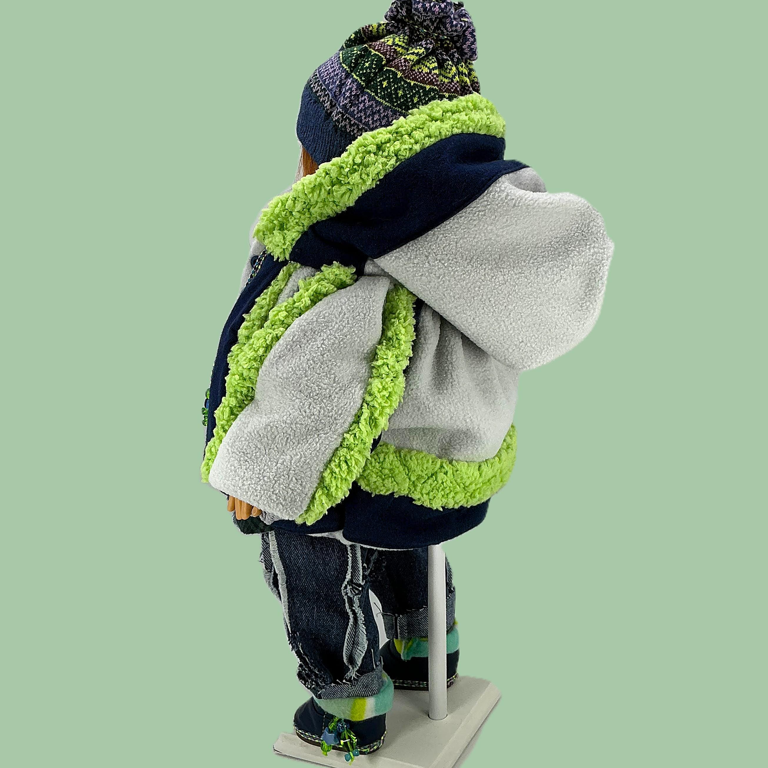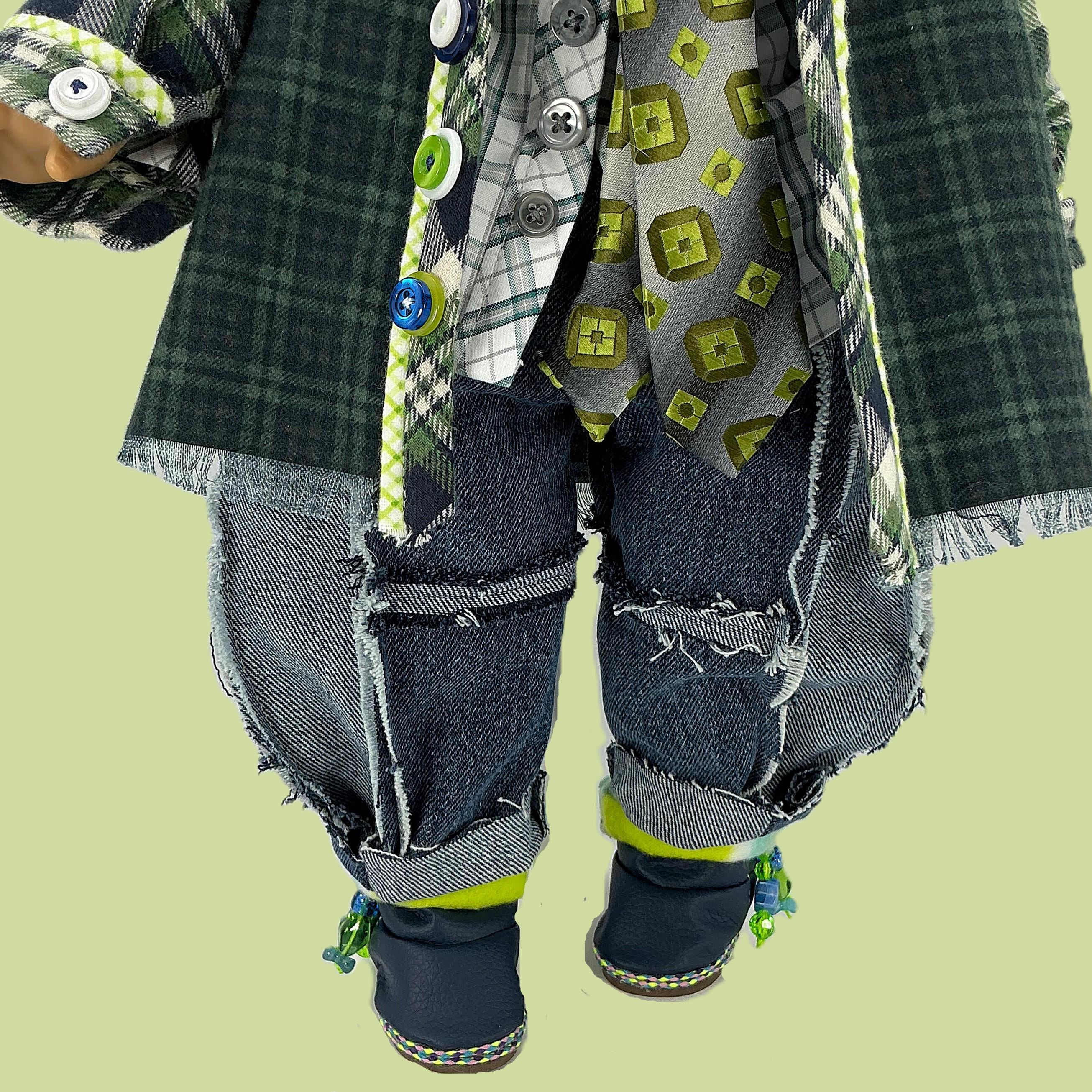 DETAILS: Winter navy blue and lime green colors! (kinda like the Sea Hawks). The fabrics are cotton, flannel, fleece, denim, and knits. Charms, ribbons, and buttons are used as trims. Items have finished seams or lining unless distressed.